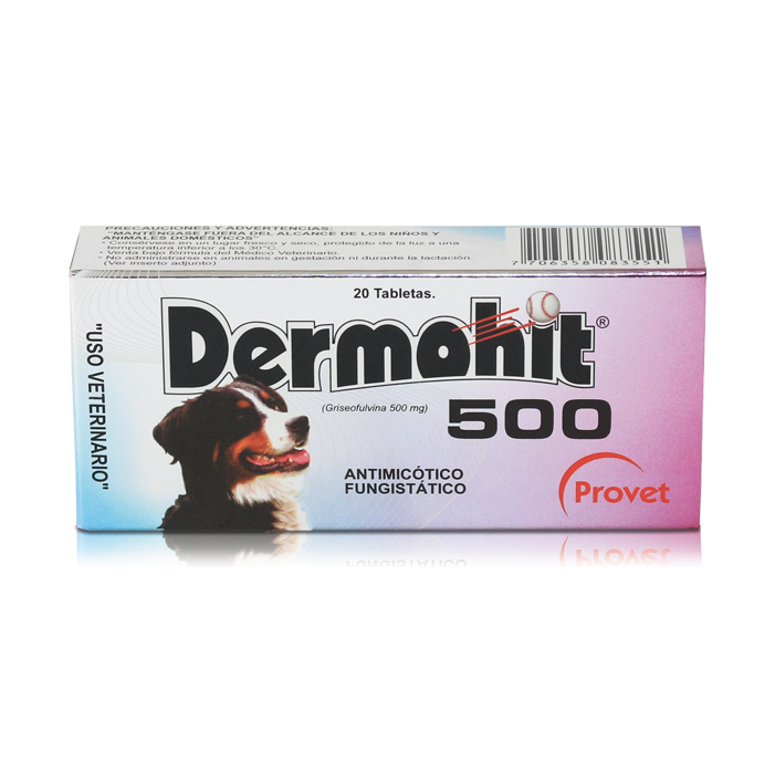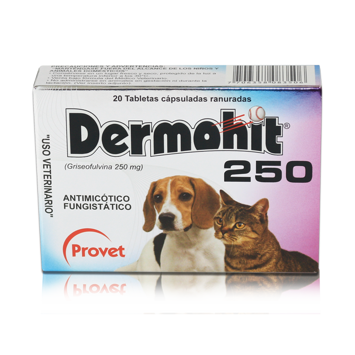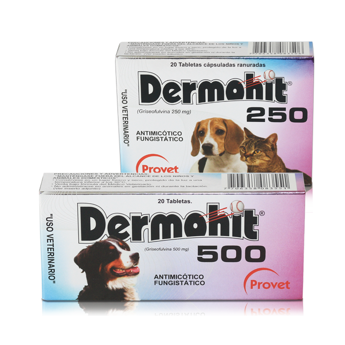 DERMOHIT® Es Griseofulvina micronizada para uso en perros y gatos en el tratamiento de infecciones fúngicas dermatofíticas (tiñas), enfermedades fácilmente transmisibles a los humanos. Ayuda en la eliminación de los síntomas de prurito, enrojecimiento, descamación e infecciones interdigitales y de los pulpejos.
